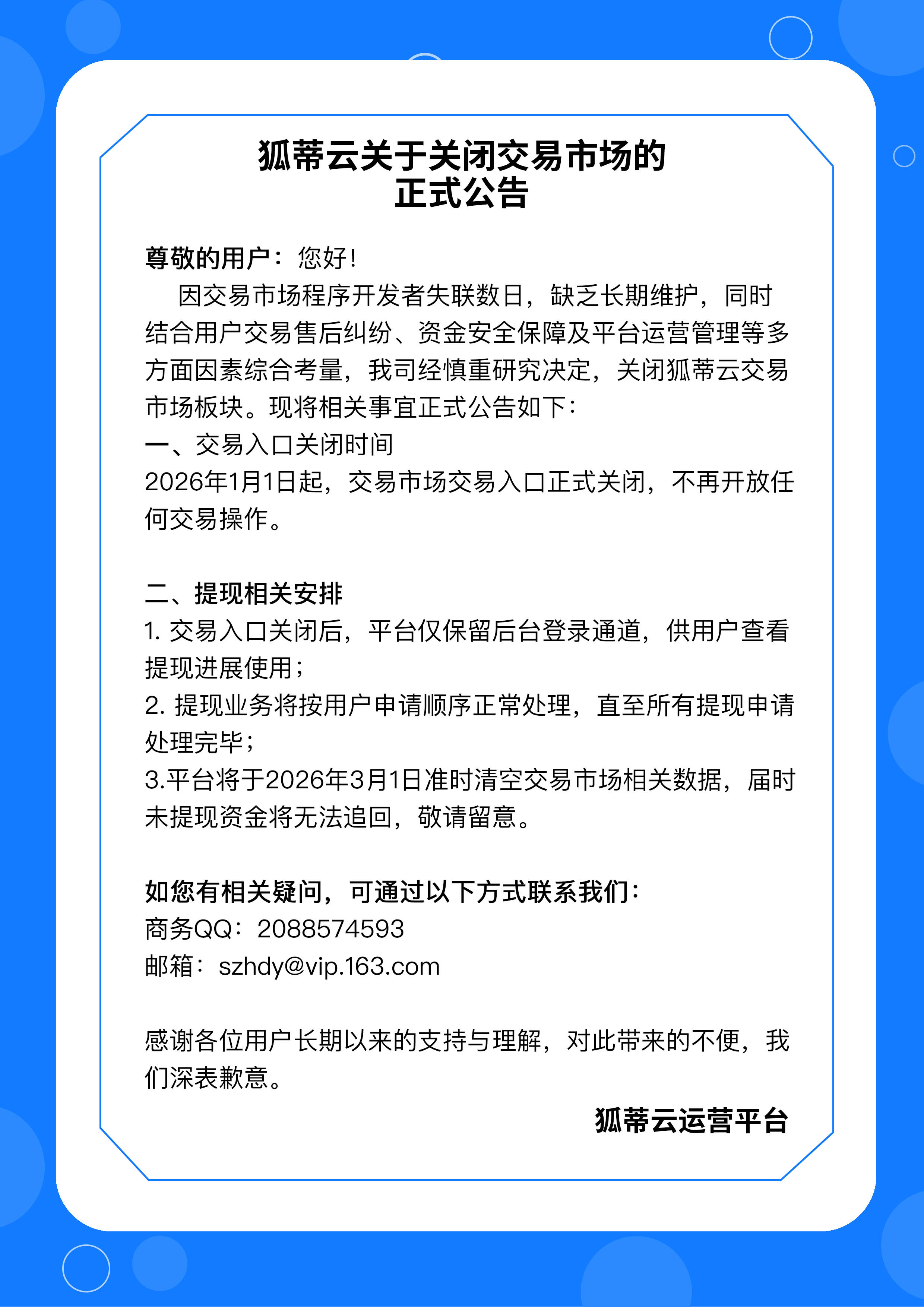 5. 如因用户自身原因导致网站程序、虚拟主机、VPS/ 云服务器系统、独立服务器系统、客户中心账户遭到入侵导致的损失,狐蒂云不负责任。