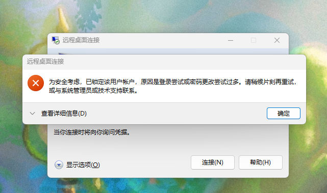 相信大家在登录windows系统的时候有时候会会出现这个错误,这个错误的话,一般是因为您的公网ip远程端口一直被人暴力破解触发了windows系统安全策略进行锁定账号登录,该问题很容易解决,按照以下教程就可以恢复正常登录。